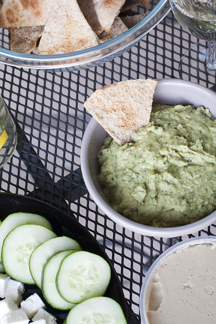 Since it’s so hot out [still!], and I had some leftover kale from the chorizo, potato, and kale tacos, I made hummus. That’s the next logical choice, right? Andrew’s on a hummus kick anyway, so that didn’t hurt either. We had a mini-Meditteranean feast on the balcony that night. Cool, creamy hummus, baba ganoush [bought because I didn’t want to take the time to roast eggplant], a brick of feta, a bunch of sliced cucumber [perfect for dipping!], and a bunch of fresh made pita chips. Note: Do not leave the pita chips unattended on the grill. They’ll turn into a black, charcoal mess really fast. Yum.